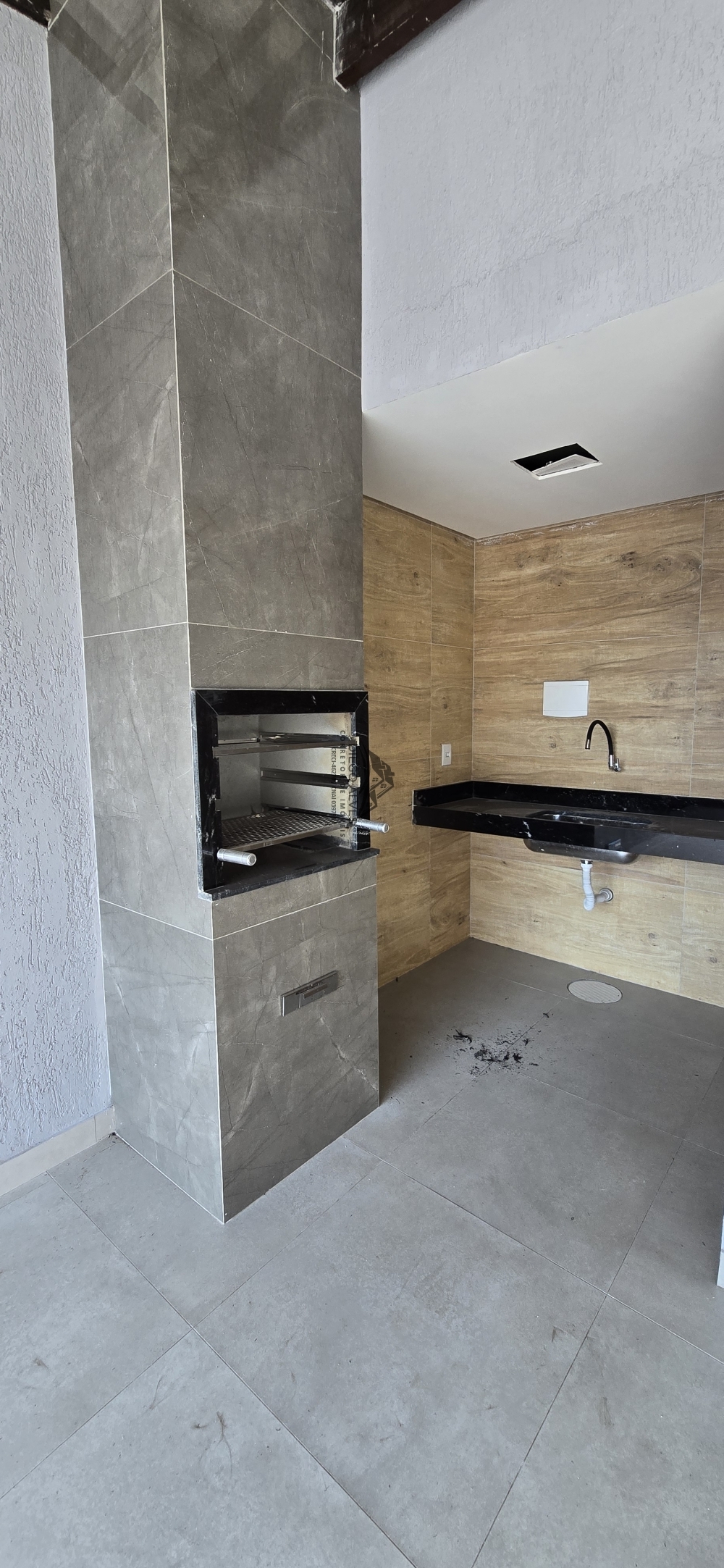 Área gourmet completa com churrasqueira, revestimento em porcelanato e integração com o quintal